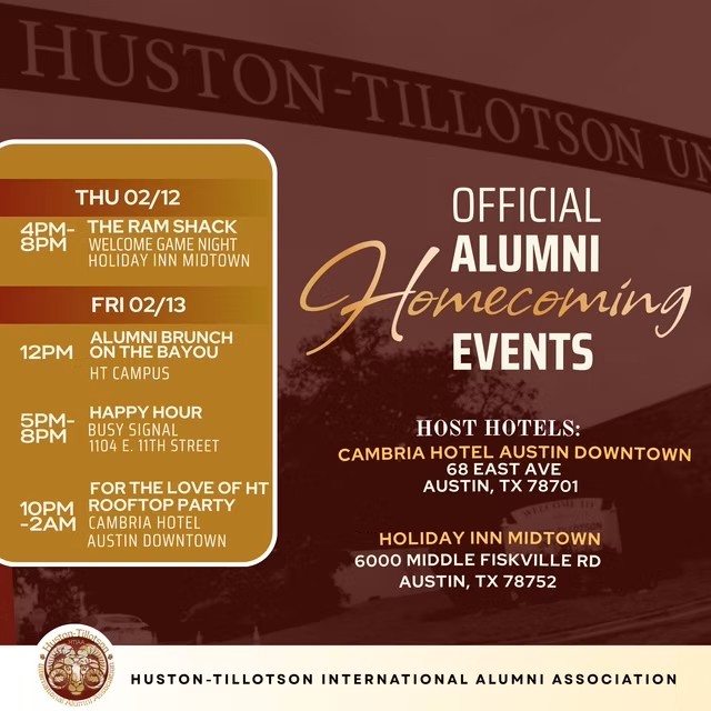Austin is calling, Rams! The Huston-Tillotson International Alumni Association – Houston Chapter proudly invites alumni and ex-students to HT Homecoming 2026. This high-energy weekend is all about fellowship, celebration, and Ram pride—bringing generations together to reconnect, reminisce, and celebrate the legacy we continue to build together.